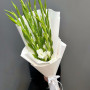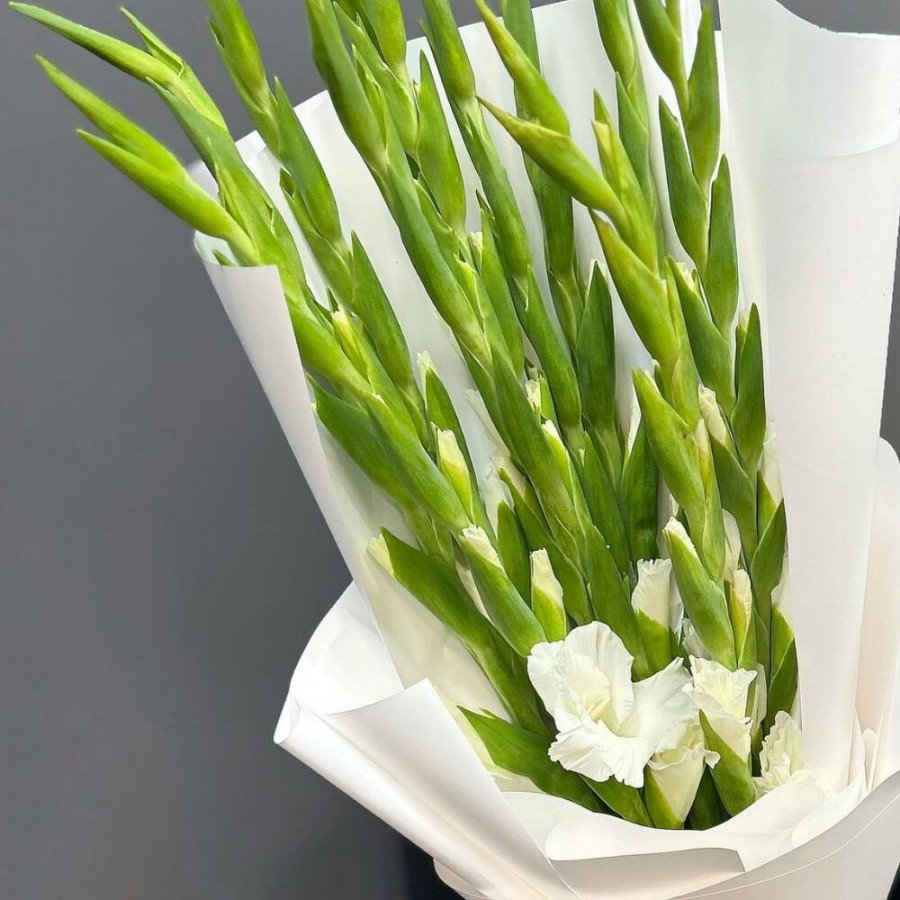 На фото букет из 11 белых гладиолусов. В составе: гладиолус 11 шт, дизайнерская упаковка 1 шт, . Все цветы свежие и ароматные, букет красиво оформлен и отлично подходит для подарка. Доступна доставка цветов или самовывоз.