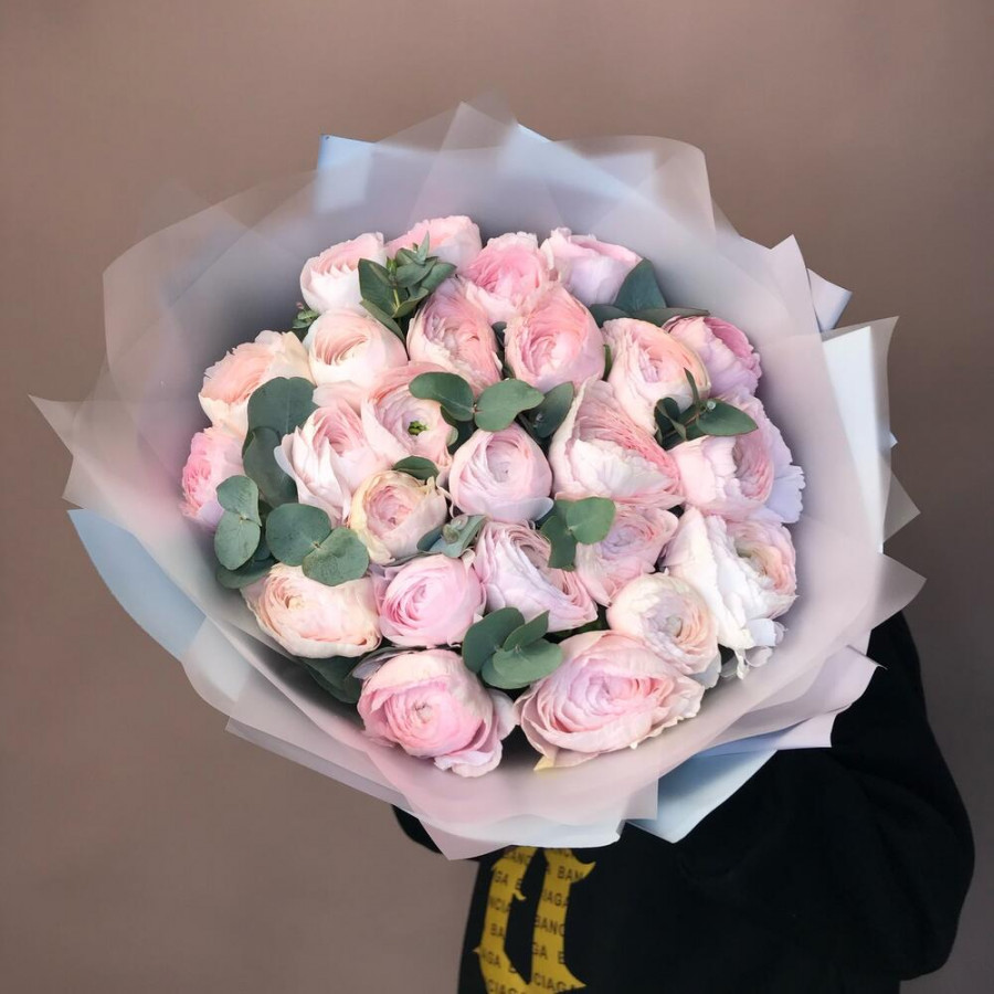 На фото букет из 25 розовых ранункулюсов. В составе: ранункулюс 25 шт, эвкалипт 10 шт, дизайнерская упаковка 1 шт, банксия 0 шт, . Все цветы свежие и ароматные, букет красиво оформлен и отлично подходит для подарка. Доступна доставка цветов или самовывоз.