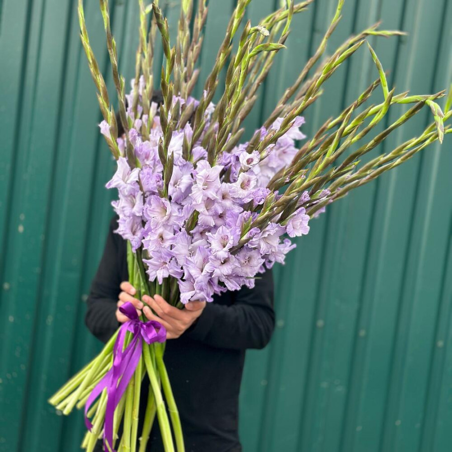На фото букет из 25 сиреневых гладиолусов. В составе: гладиолус 25 шт, атласная лента 1 шт, . Все цветы свежие и ароматные, букет красиво оформлен и отлично подходит для подарка. Доступна доставка цветов или самовывоз.