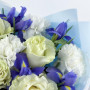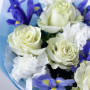 Букет из белых гвоздик, синих ирисов и белых роз в Новошахтинске