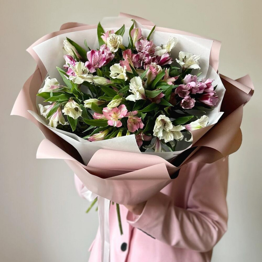 На фото букет из 11 альстромерий микс. В составе: альстромерия 11 шт, крафт-бумага 1 шт, атласная лента 1 шт, . Все цветы свежие и ароматные, букет красиво оформлен и отлично подходит для подарка. Доступна доставка цветов или самовывоз.