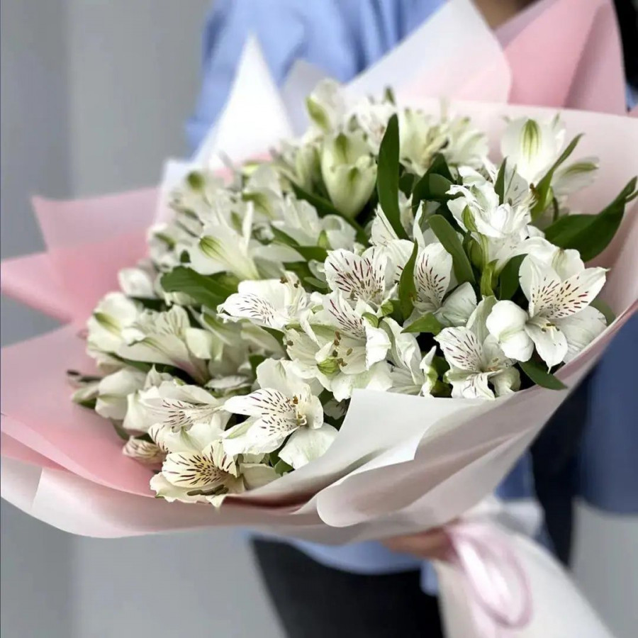 На фото букет из 15 белых альстромерий. В составе: альстромерия 15 шт, крафт-бумага 1 шт, атласная лента 1 шт, . Все цветы свежие и ароматные, букет красиво оформлен и отлично подходит для подарка. Доступна доставка цветов или самовывоз.