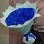 На фото букет из 51 синей розы. В составе: роза (синяя) 51 шт, крафт-бумага 1 шт, атласная лента 1 шт, . Все цветы свежие и ароматные, букет красиво оформлен и отлично подходит для подарка. Доступна доставка цветов или самовывоз.