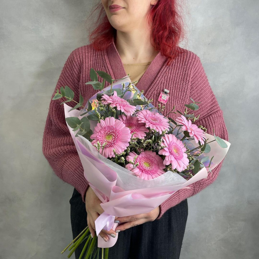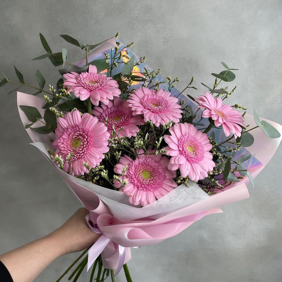 На фото букет из 7 розовых гербер. В составе: гербера 7 шт, эвкалипт 2 шт, крафт-бумага 1 шт, атласная лента 1 шт, . Все цветы свежие и ароматные, букет красиво оформлен и отлично подходит для подарка. Доступна доставка цветов или самовывоз.