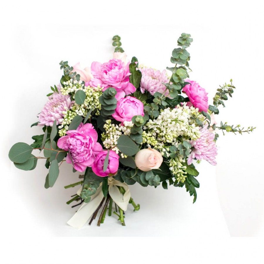 Уникальный дизайн данного букета приведет в неописуемый восторг самых взыскательных натур. При его создании используются свежесрезанные, невероятно ароматные веточки сирени, элегантные розы отборных сортов, пышные пионы, великолепные хризантемы, писташ и насыщенно зеленые листочки эвкалипта. Благодаря минималистичному декору лентой общий вид композиции смотрится выгодно и очаровательно.