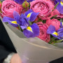 Букет из розовых пионовидных роз и синих ирисов в Новошахтинске