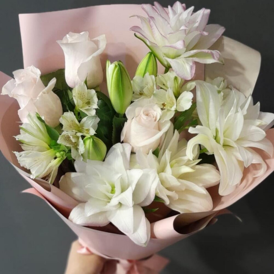 На фото букет «нежность в облаках». В составе: лилия 2 шт, роза 3 шт, альстромерия 2 шт, дизайнерская упаковка 1 шт, атласная лента 1 шт, . Все цветы свежие и ароматные, букет красиво оформлен и отлично подходит для подарка. Доступна доставка цветов или самовывоз.
