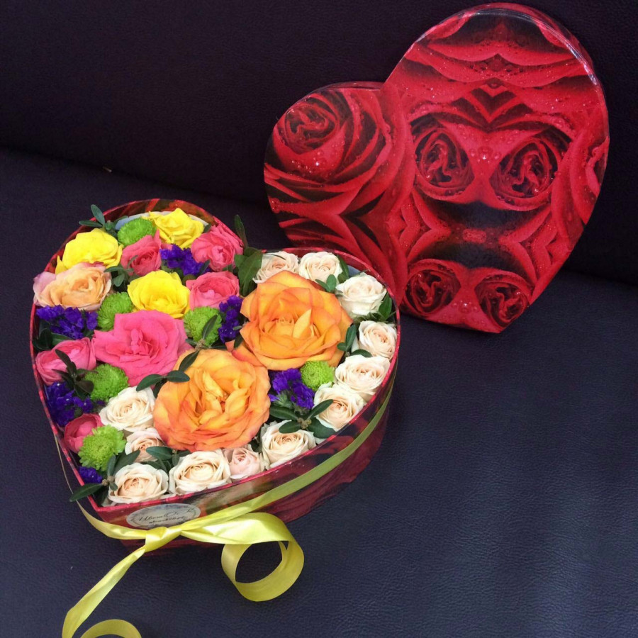 Яркая коробка в виде сердца, собранная из нежных бутонов роз оранжевого, кремового, желтого и розового цвета,соцветий кустовой хризантемы с крапинками фиолетовой статицы. Необычная подача и многообразие цветов и волнительных ароматов приятно удивит получательницу, станет восхитительным подарком на 14 февраля или на свидании станет поводом признаться в любви.