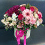 На фото герберы и хризантемы в коробке. В составе: гербера 3 шт, хризантема кустовая 5 шт, хризантема одноголовая 4 шт, кустовая роза 3 шт, альстромерия 5 шт, роза 4 шт, гвоздика 3 шт, шляпная коробка (m) 1 шт, атласная лента 1 шт, . Все цветы свежие и ароматные, букет красиво оформлен и отлично подходит для подарка. Доступна доставка цветов или самовывоз.