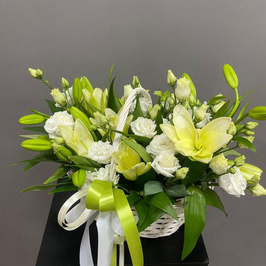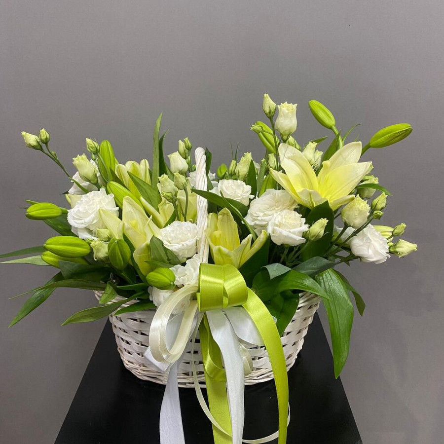 На фото корзина с белыми лилиями и эустомами. В составе: лилия 5 шт, эустома (лизиантус) 6 шт, корзина (s) 1 шт, атласная лента 1 шт, . Все цветы свежие и ароматные, букет красиво оформлен и отлично подходит для подарка. Доступна доставка цветов или самовывоз.