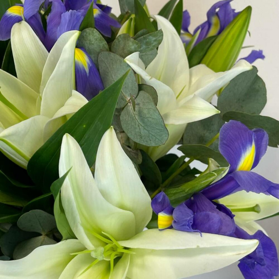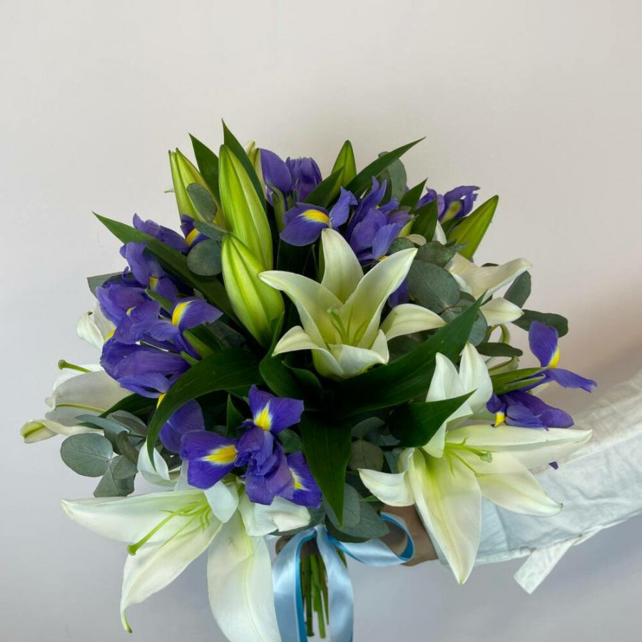 На фото букет из белых лилий с синими ирисами. В составе: лилия 5 шт, ирис 9 шт, эвкалипт 1 шт, дизайнерская упаковка 1 шт, атласная лента 1 шт, . Все цветы свежие и ароматные, букет красиво оформлен и отлично подходит для подарка. Доступна доставка цветов или самовывоз.