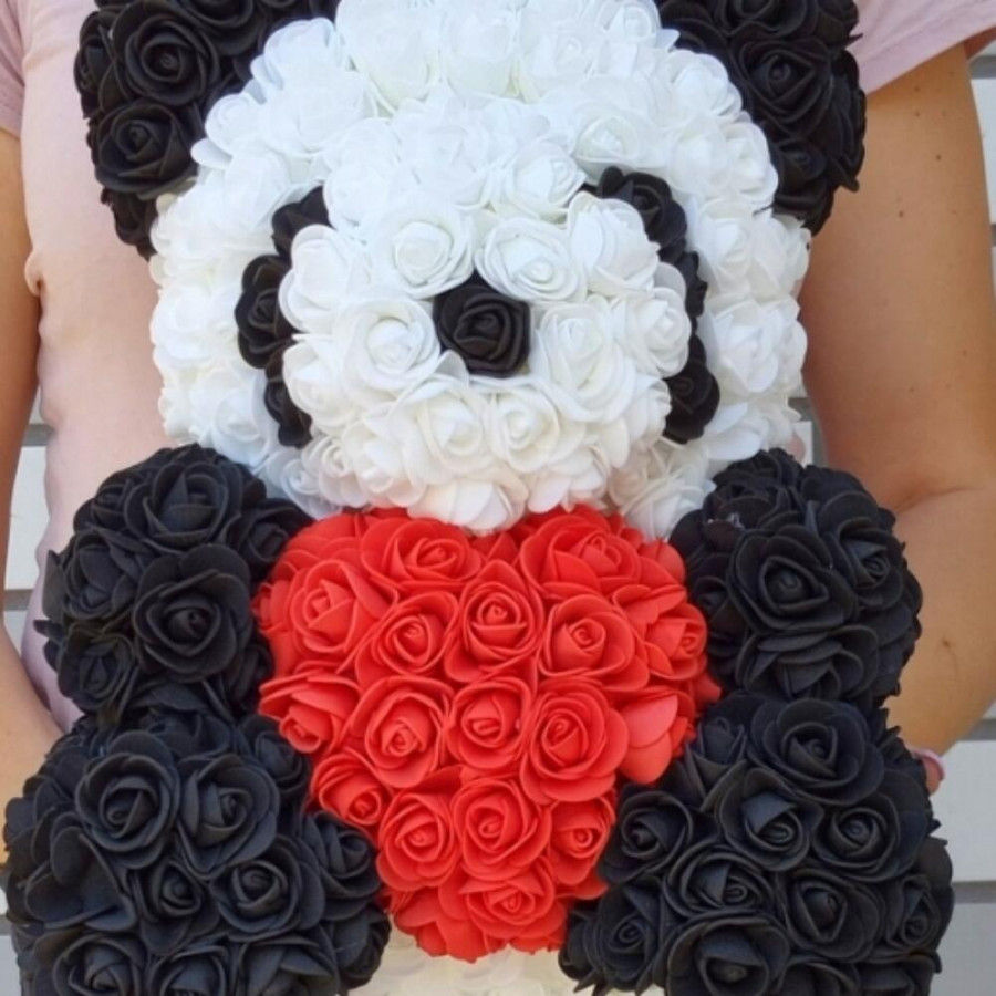 На фото мишка из роз «панда». В составе: . Все цветы свежие и ароматные, букет красиво оформлен и отлично подходит для подарка. Доступна доставка цветов или самовывоз.