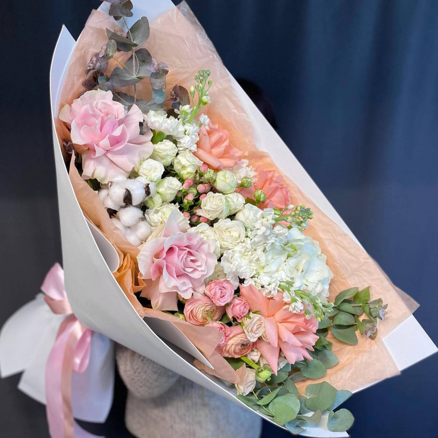 На фото огромный букет с гортензией. В составе: гортензия 1 шт, роза 4 шт, кустовая роза 9 шт, хлопок 3 шт, маттиола 4 шт, эвкалипт 3 шт, крафт-бумага 1 шт, . Все цветы свежие и ароматные, букет красиво оформлен и отлично подходит для подарка. Доступна доставка цветов или самовывоз.