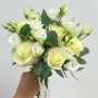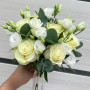 На фото свадебный букет из белых эустом и роз. В составе: эустома (лизиантус) 3 шт, роза 7 шт, бруния 2 шт, эвкалипт 1 шт, атласная лента 2 шт, . Все цветы свежие и ароматные, букет красиво оформлен и отлично подходит для подарка. Доступна доставка цветов или самовывоз.